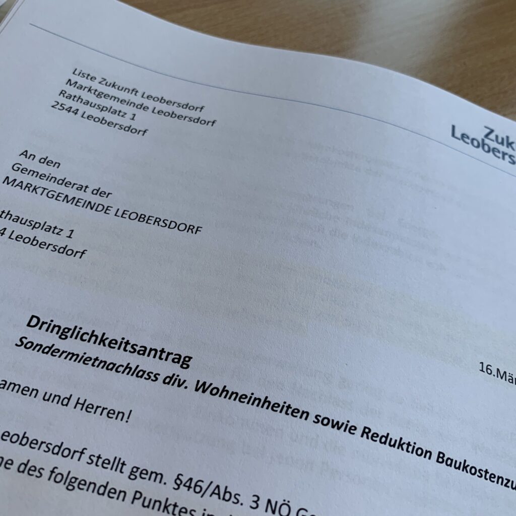 Per Dringlichkeitsantrag der Liste Zukunft Leobersdorf konnte in der gestrigen Gemeinderatssitzung einstimmig ein Sondermietnachlass für über 60 Mietobjekte beschlossen werden! Weiters wurde in der Neuvergabe von leerstehenden Objekten die Möglichkeit geschaffen den zu zahlenden Baukostenzuschuss deutlich zu reduzieren!